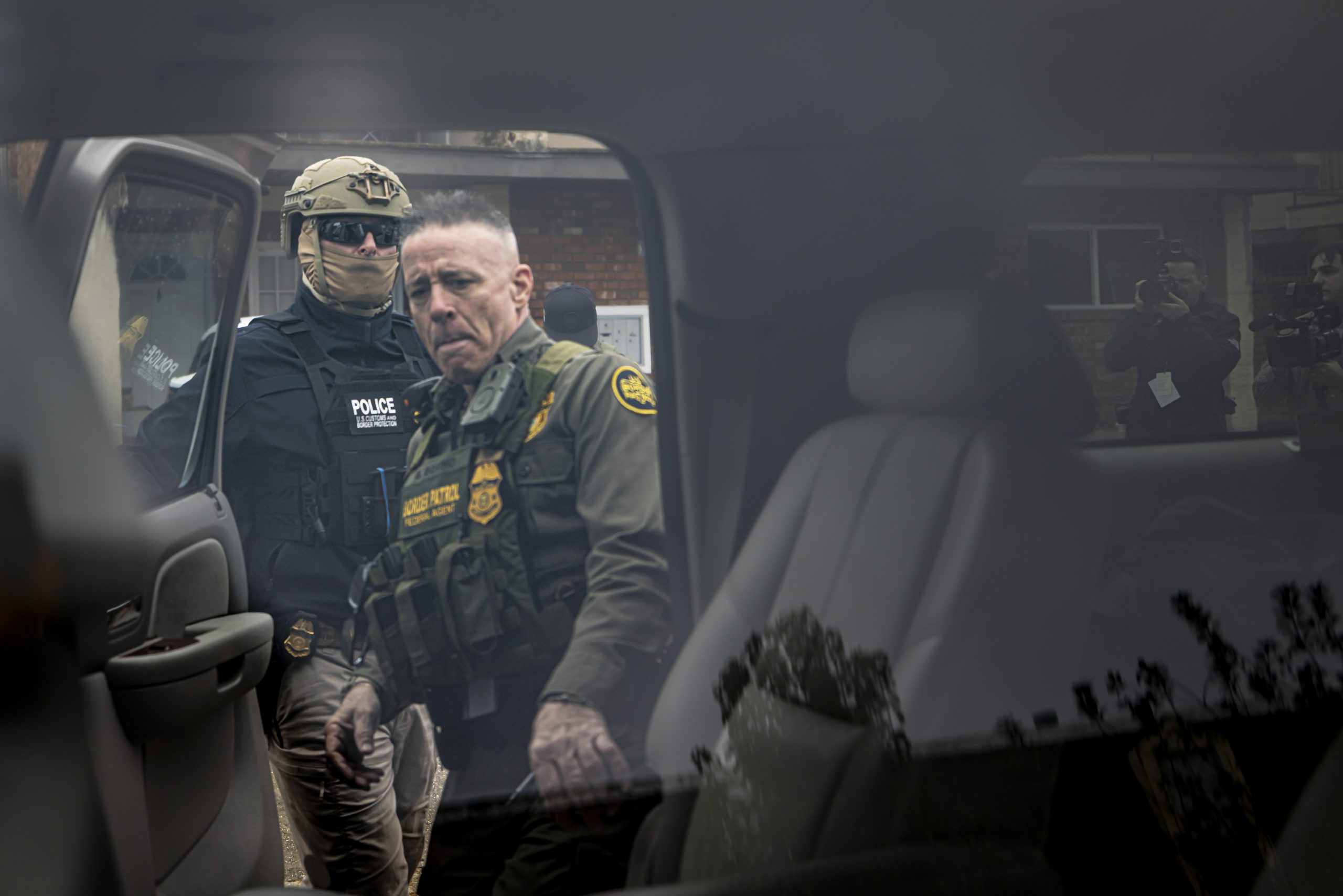 If you find a raid, it’s usually in progress. You’ll hear whistles and horns—activists warning the community that ICE is nearby. Frightened people peer out a cracked-open door or behind a half-drawn shade. U.S. Border Patrol commander Gregory Bovino will climb out of the back seat of his gold Suburban, wait for masked agents in tactical gear to converge around him, and then begin to prowl the sidewalks and streets. They all have cameras. Most of the agents have GoPros attached to their body armor or ballistic helmets, but Bovino always travels with at least one agent who carries professional video equipment, usually trained on Bovino.