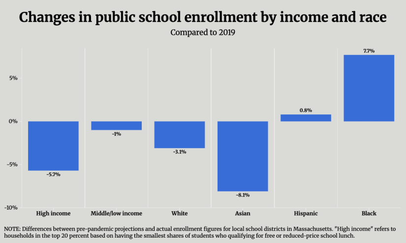 The article, published in the journal Education Next, draws on state and national data to measure changes in student enrollment over the last half-decade. Both in Massachusetts and around the country, white and Asian parents were far likelier to pull their children out of public schools than Hispanics and African Americans. Kindergarten and middle school enrollment plunged, while elementary schools actually saw a small bump in total students.