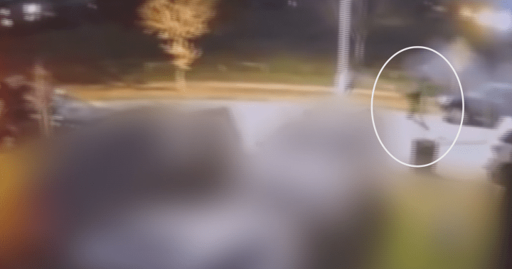 Video shows a person shooting a gun while running after a vehicle. A few seconds later, more gunfire erupts as the figure runs back