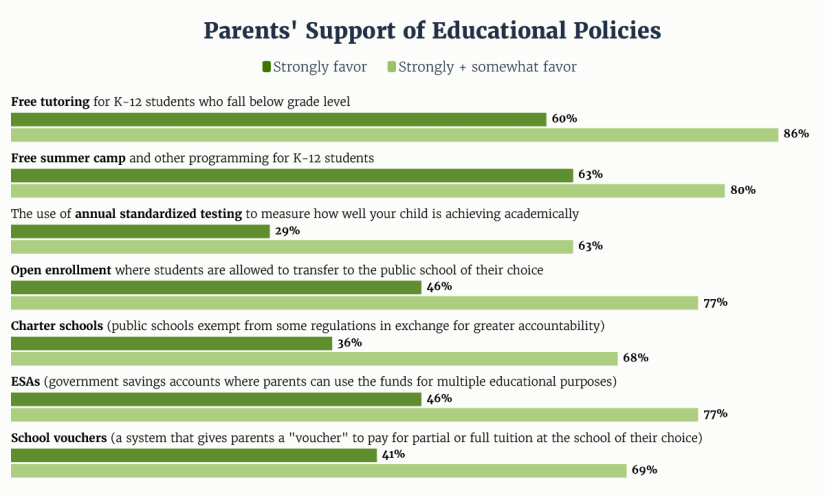 - 86% of parents now favor free tutoring, while 80% support free summer camps; 77% back open enrollment and universal ESAs;