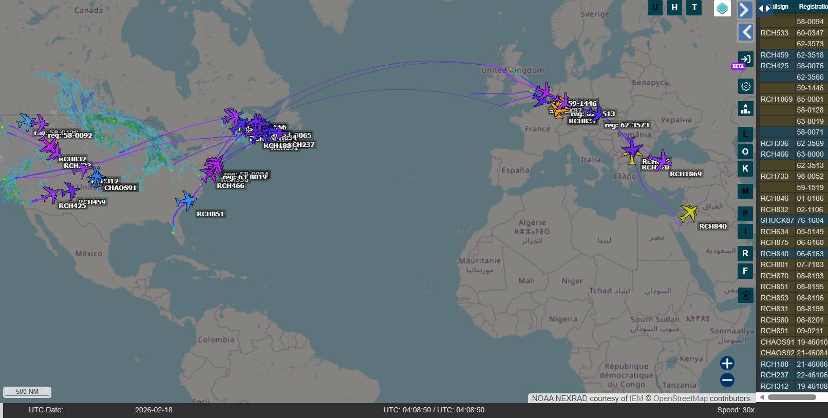Multiple open-source intelligence accounts on social media shared images of what OSINTdefender called “one of the busiest days for the US Air Force in Europe that I have seen in recent history, with close to a dozen KC-135R/T Stratotankers airborne across the Mediterranean and off the coast of Spain, while a steady line of C-17A Globemaster IIIs can be seen heading towards and returning from bases in the Middle East.”